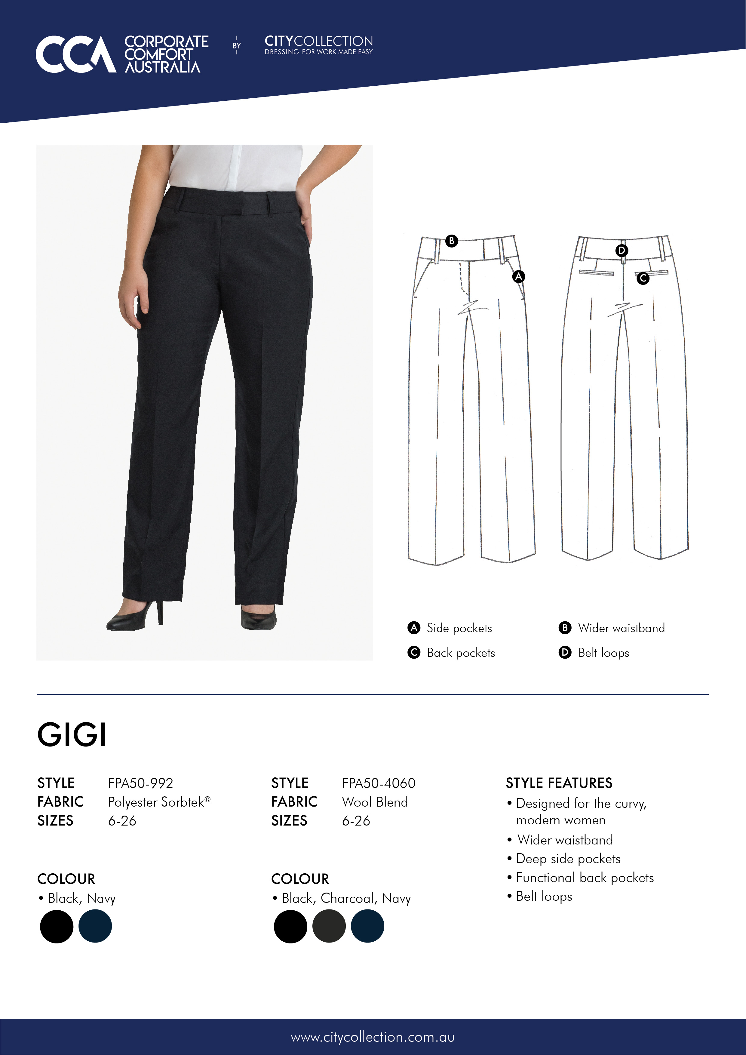 Designed for the curvy, modern women, with a wider waistband, deep side pockets, belt loops and functional back pockets.